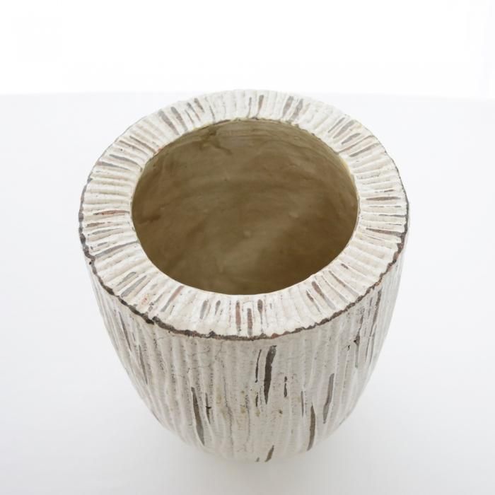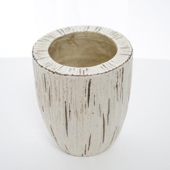 白樺のようなアンティーク調クリームの優しさと味わいのあるヨーロッパらしい陶器のフラワーベース。全体的に厚みがありずっしりしています。